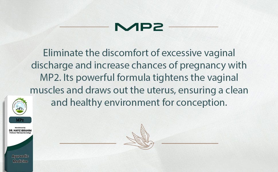 MP2 is a specialized herbal remedy designed to address leucorrhoea and support uterine health. It helps reduce excessive vaginal discharge, intubates a prolapsed uterus to restore its position, and promotes conditions favorable for pregnancy. Additionally, MP2 aids in tightening the uterus and alleviating associated symptoms such as breast discomfort, abdominal melasma, and double chin caused by moisture imbalance. This expert formulation offers a natural approach to managing these gynecological concerns effectively.